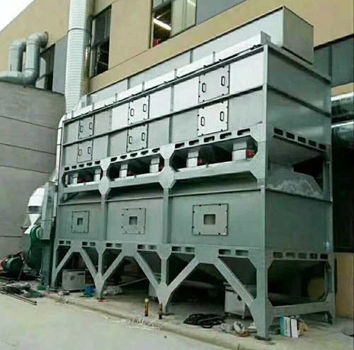 在化學反應過程中,利用催化劑降低燃燒溫度,加速有毒有害氣體完全氧化的方法,叫做催化燃燒法。由于催化劑的載體是由多孔材料制作的,具有較大的比表面積和合適的孔徑,當加熱到300~450℃的有機氣體通過催化層時,氧和有機氣體被吸附在多孔材料表層的催化劑上,增加了氧和有機氣體接觸碰撞的機會,提高了活性,使有機氣體與氧產生劇烈的化學反應而生成CO2和H2O,同時產生熱量,從而使得有機氣體變成無毒無害氣體。